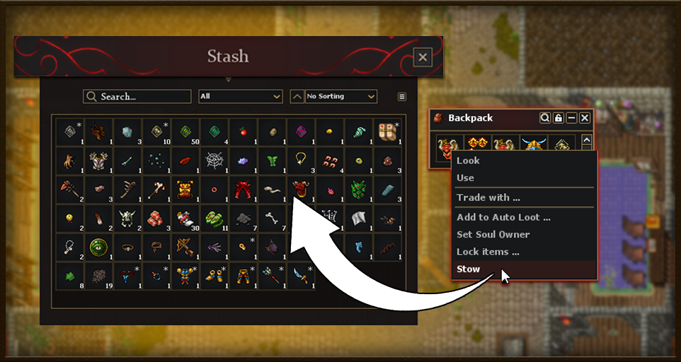 Items can be sent to the stash individually or by depositing the entire backpack with a single click. The Send to Stash option also lets you quickly move items directly from your inventory.